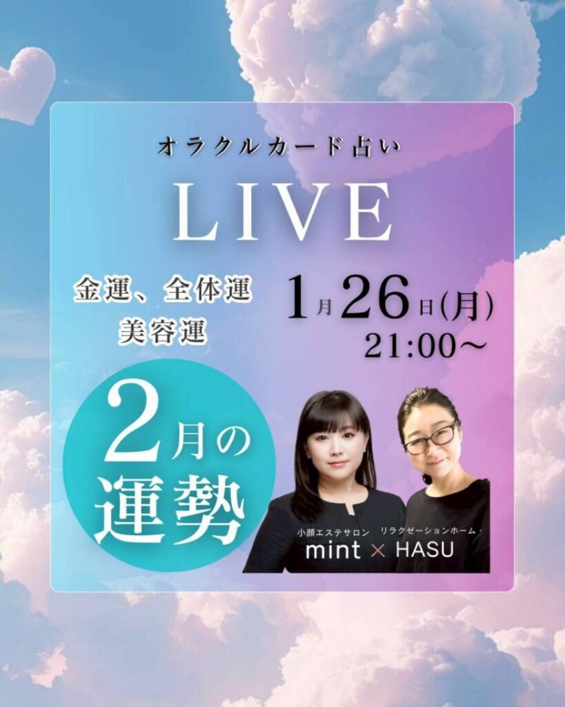 1月26日(月)21時より、リラクゼーションホームHASUのASAYOちゃんと一緒に、オラクルカードを使った選択式リーディングのインスタLIVEを行います。
