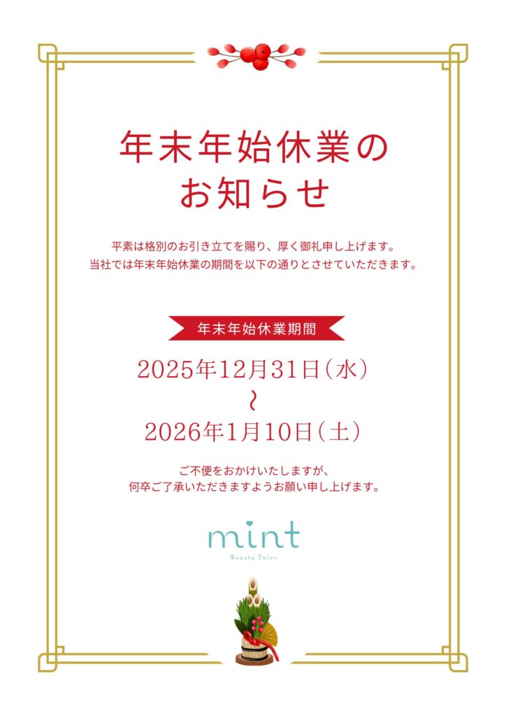 2025年12月31日(水)〜2026年1月10日(土)までお休みです。