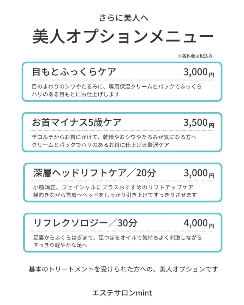 基本メニューを受けられた方への美人オプションです。 ※全て税込価格です